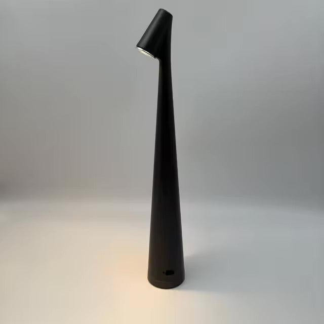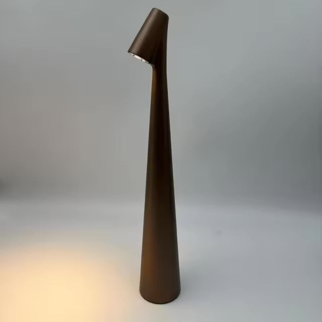 This sleek, LED table lamp features a striking African-modern aesthetic, and casts a warm downward glow.